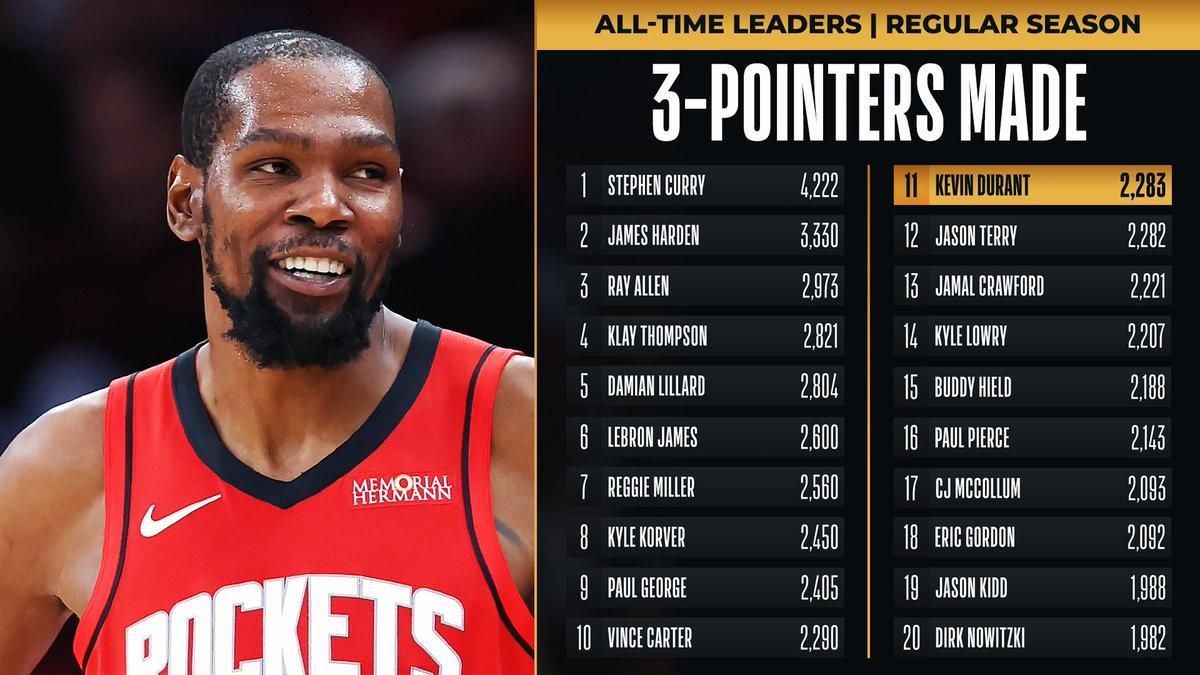 在比赛进行到第二节时,杜兰特命中了本场比赛的第二记三分。这也让他的生涯总三分命中数达到2283记,超越独行侠名宿杰森-特里,升至历史第11位。