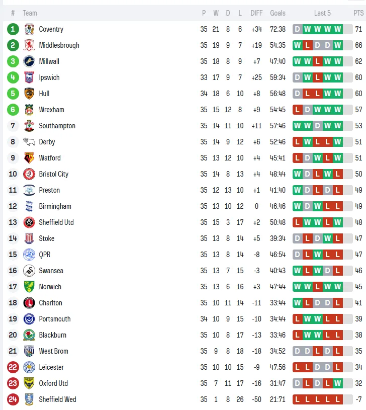 25-26赛季英冠第35轮,莱斯特城彻底崩盘,考文垂米堡两队死死咬住差距